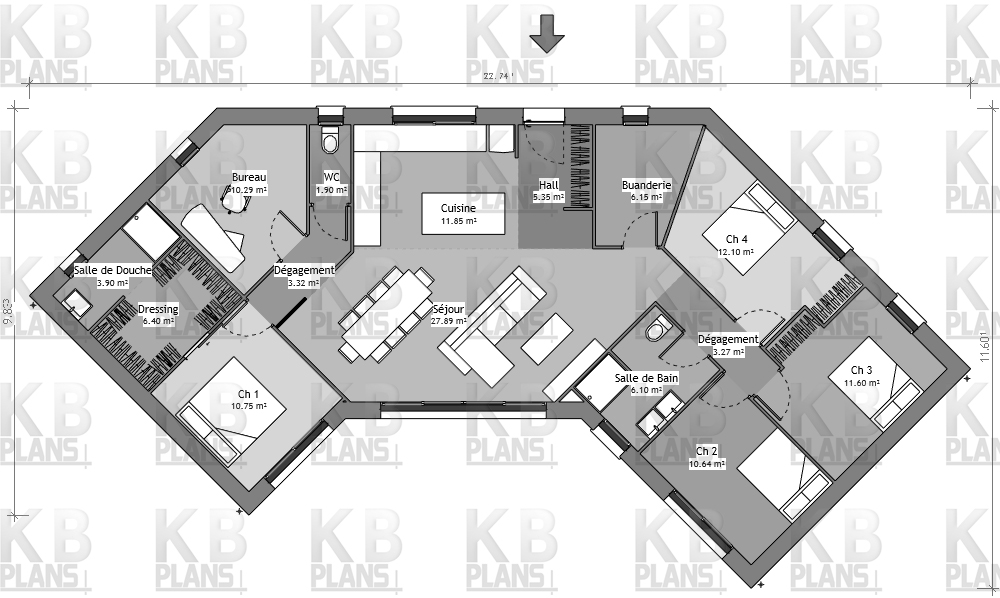 Le plan de maison Zenith est une maison de plain-pied comportant 4 chambres et un bureau. L’entrée avec placard intégré dessert une pièce de vie avec cuisine pouvant être en partie cloisonnée. Cette pièce de vie sépare le coin nuit parental et le coin nuit du reste de la famille. Du côté gauche, on retrouve un dégagement desservant un WC séparé, un bureau et une suite parentale composée de la chambre, d’un dressing, et d’une salle de douche. Le côté droit est composé d’une buanderie, d’une salle de douche avec WC et de 3 chambres dont 2 avec placard intégré.