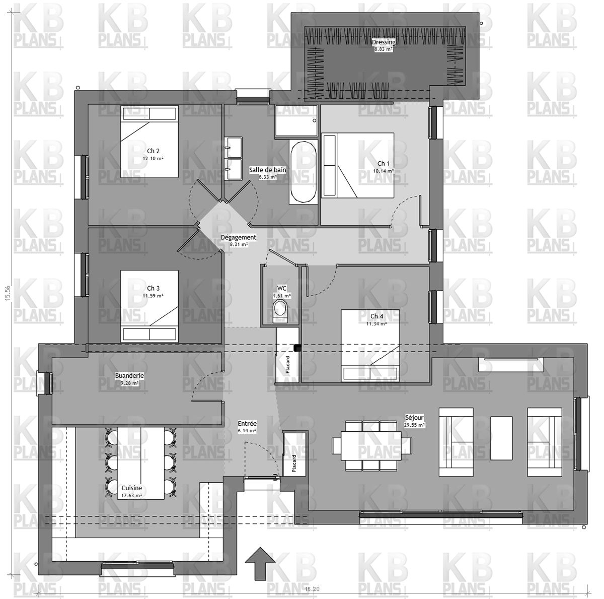Le plan HARMONY est un modèle de maison de plain-pied comptant 4 chambres. La cuisine est séparée du salon séjour par un dégagement faisant office de hall d’entrée comportant des placards. Une grande baie inonde le séjour de lumière. Le dégagement dessert l’ensemble des autres pièces dont un WC séparé. La position centrale de la salle de bain dans la partie nuit de la maison est idéale. La chambre parentale comporte un dressing de près de 9m².